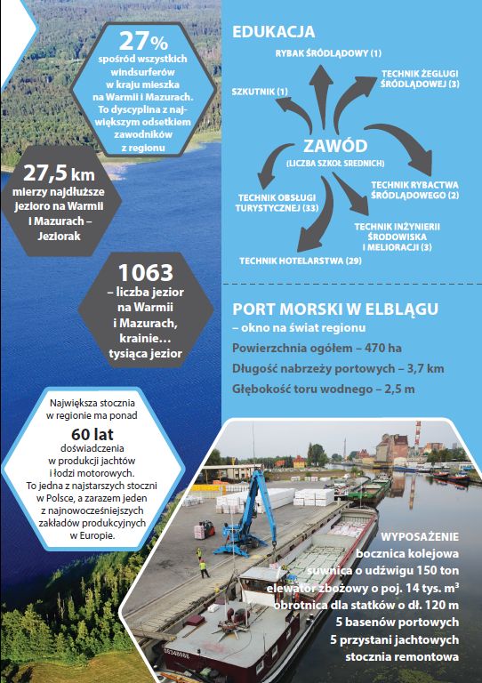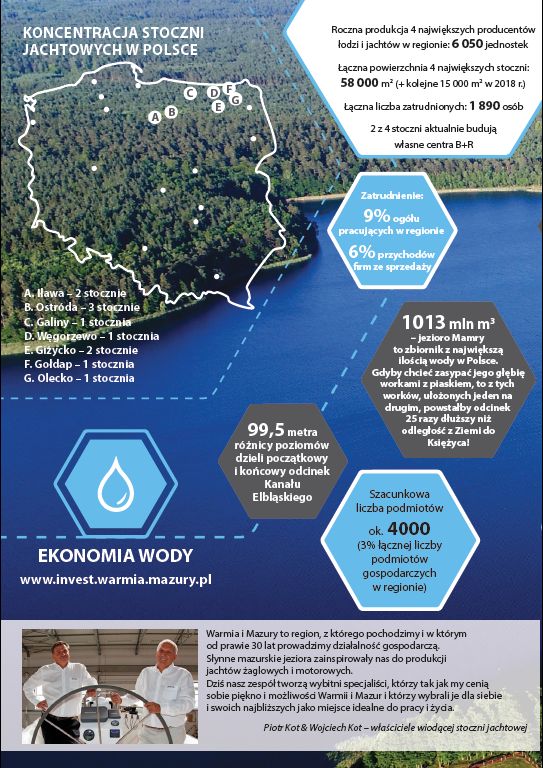 Specjalizacja bazuje na największych w Polsce zasobach wód powierzchniowych – woda stanowi nieco ponad 20 procent powierzchni województwa warmińsko-mazurskiego, co daje regionowi pierwsze miejsce w kraju. Nic więc dziwnego, że Warmia i Mazury – znane także jako Kraina Tysiąca Jezior – intensywnie wykorzystują potencjał związany z wodą i między innymi wiążą z nim swój rozwój gospodarczy.