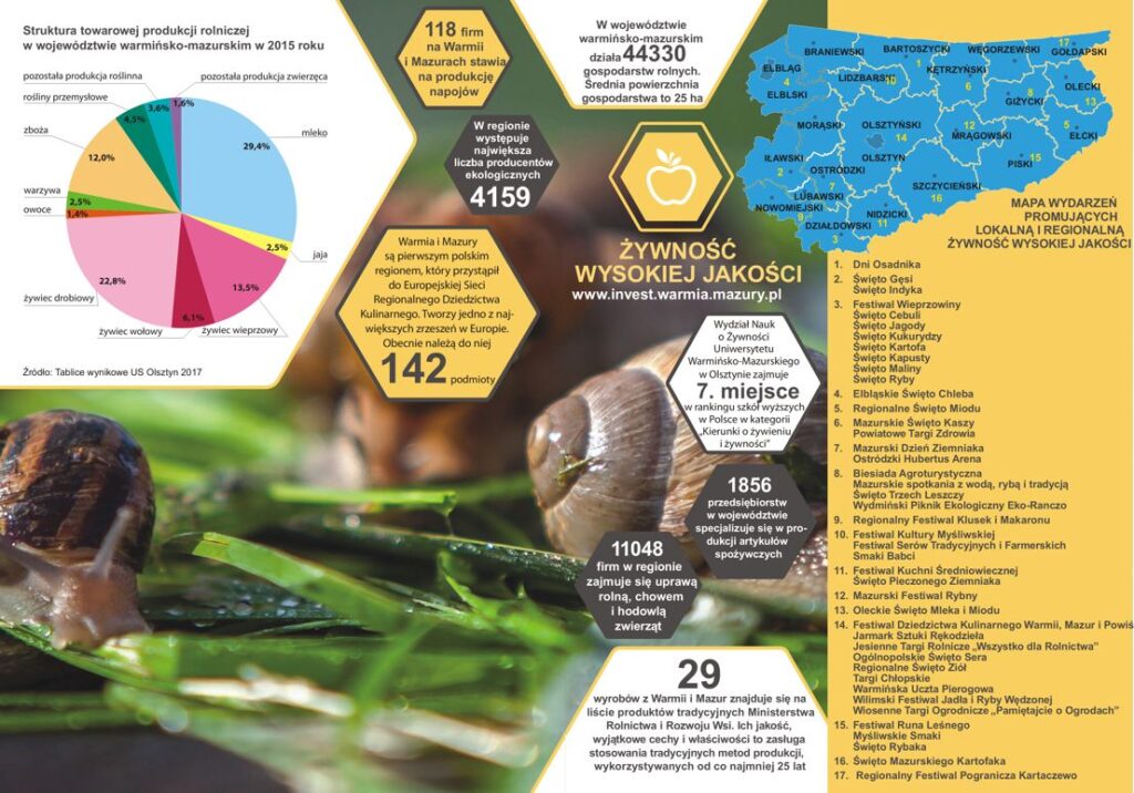 Warmia i Mazury mają idealne warunki, aby skorzystać z trendu na popyt na żywność wysokiej jakości (w tym także żywność wytworzoną z ekologicznych składników). Ponad połowę powierzchni województwa stanowią użytki rolne (54,71 %). W województwie warmińsko-mazurskim działa ok. 26 tys. małych i średnich gospodarstw dostarczających żywność naturalną, tradycyjną i ekologiczną na bazie własnych surowców. Sieć rozwija się coraz dynamicznej – obecnie co jedenaste gospodarstwo ekologiczne w Polsce znajduje się w województwie warmińsko-mazurskim (daje nam to drugie miejsce w kraju), a blisko 15 procent upraw rolnych, objętych systemem kontroli w rolnictwie ekologicznym, znajdowało się właśnie w naszym regionie. Z ekologicznych bogactw Warmii i Mazur czerpią firmy produkujące artykuły spożywcze i napoje – w regionie działa ich aż 900. To właśnie żywność wiedzie prym wśród eksportowanych z Warmii i Mazur towarów.